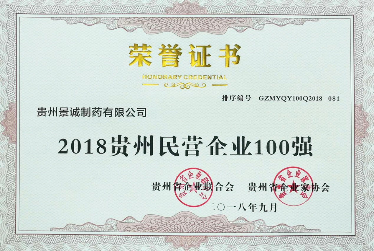 2018年9月20日,贵州省企业联合会、贵州省企业家协会发布2018贵州“双百强”企业榜单,贵州景诚制药有限公司荣获2018年“贵州民营企业100强”荣誉称号。