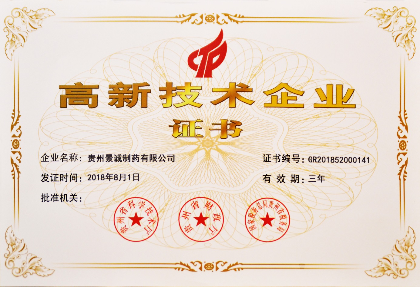 近日,贵州景诚制药有限公司获得由贵州省科学技术厅、贵州省财政厅、国家税务总局贵州省税务局联合颁发新的“高新技术企业”证书和铭牌(编号GR201852000141),再次通过高新技术企业认证。