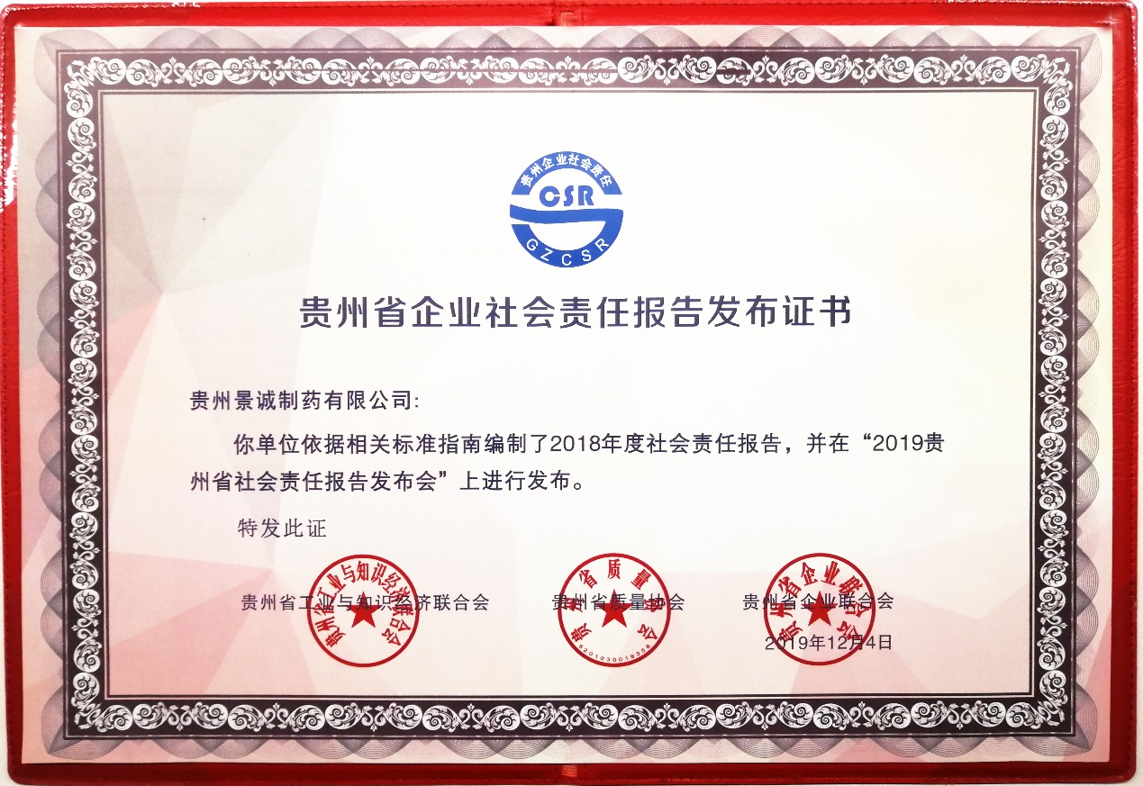 2019年12月4日,2019贵州省社会责任报告发布会在贵阳隆重举行,贵州景诚制药有限公司在会上正式发布了《2018年度社会责任报告》,获得由贵州省工业与知识经济联合会、贵州省质量协会、贵州省企业联合会联合颁发的社会责任报告发布证书。